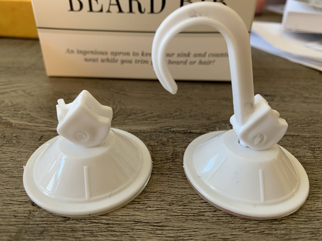 Overall my Husband was happy with his Beard Bib, the only problem was the super suction on the suction cups with a tiny little nub to grab to release the suction. He had a difficult time getting a hold of it. He had to use tweezers :)